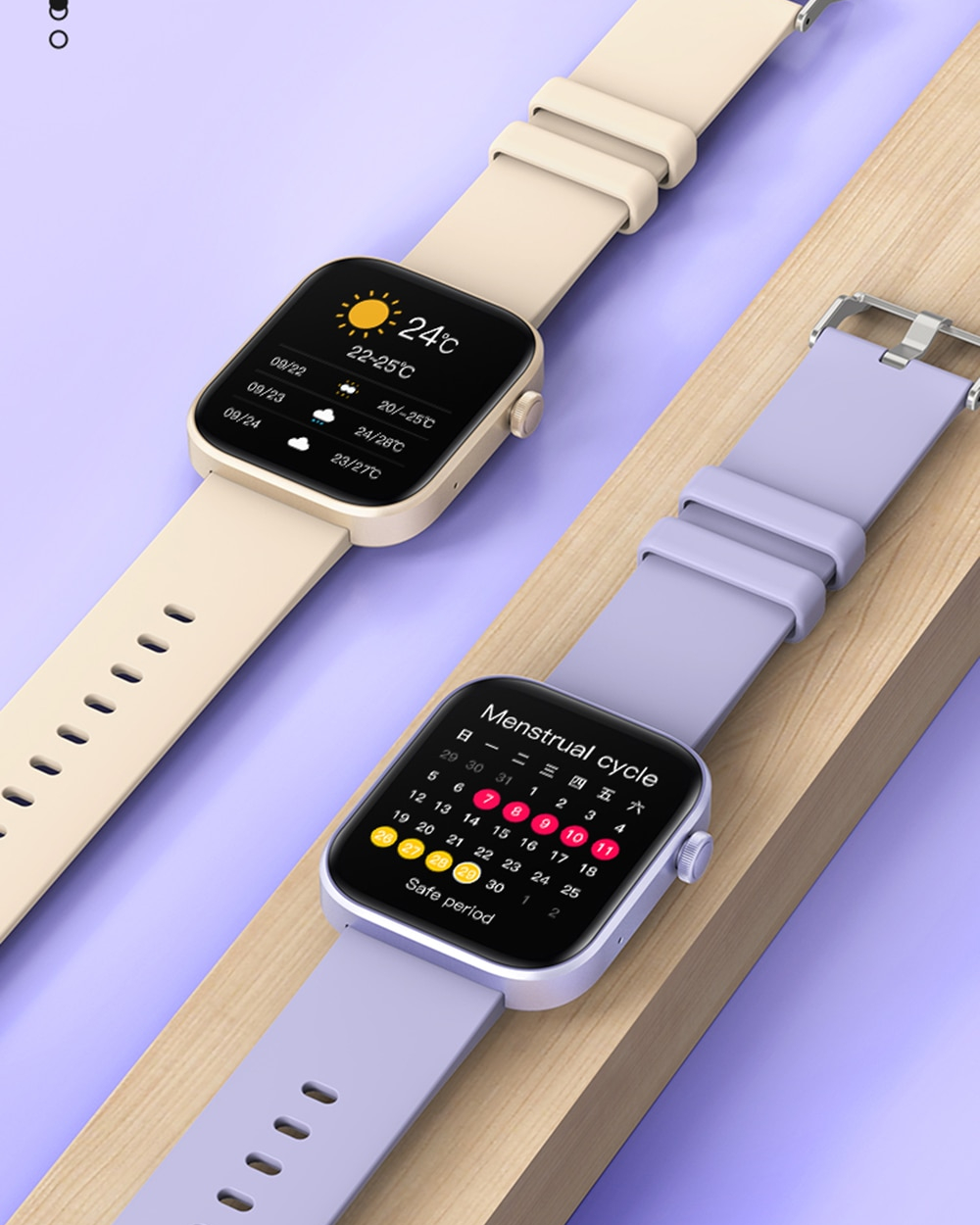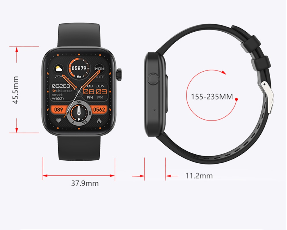 Support health APP. Wrist-based Heart Rate (automatic measurement), Blood oxygen, Blood Pressure, Sleep tracker, Drink water reminder, Reminder to move, Women’s Physiological cycle